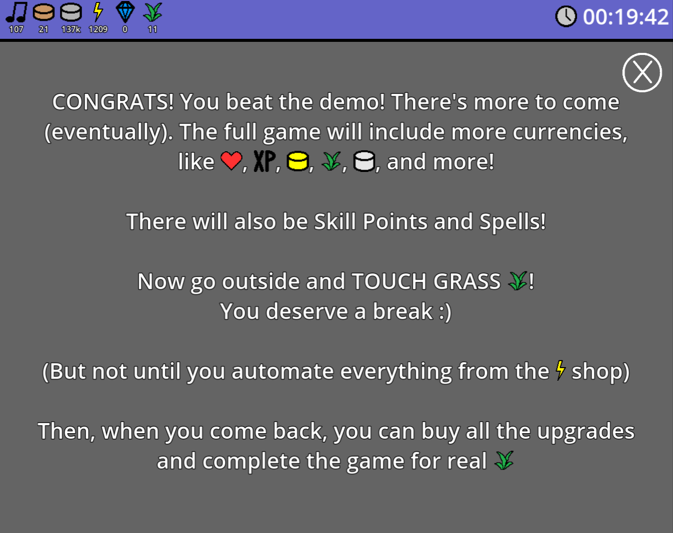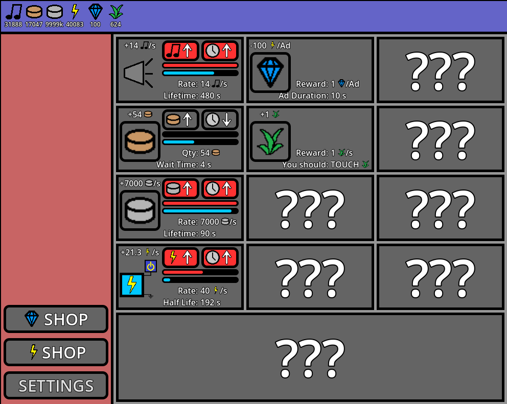 I think my intent was to have the upgrade you’re referring to play forced ads occasionally. But you have a point. I’ll probably address this by making ads take less time (especially after the first few are played), with more variety (like different versions of the ad), more interactivity (like taking you to a fake download page if you click on the ad), etc. Also, some of the upgrades may cost slightly too many diamonds lol